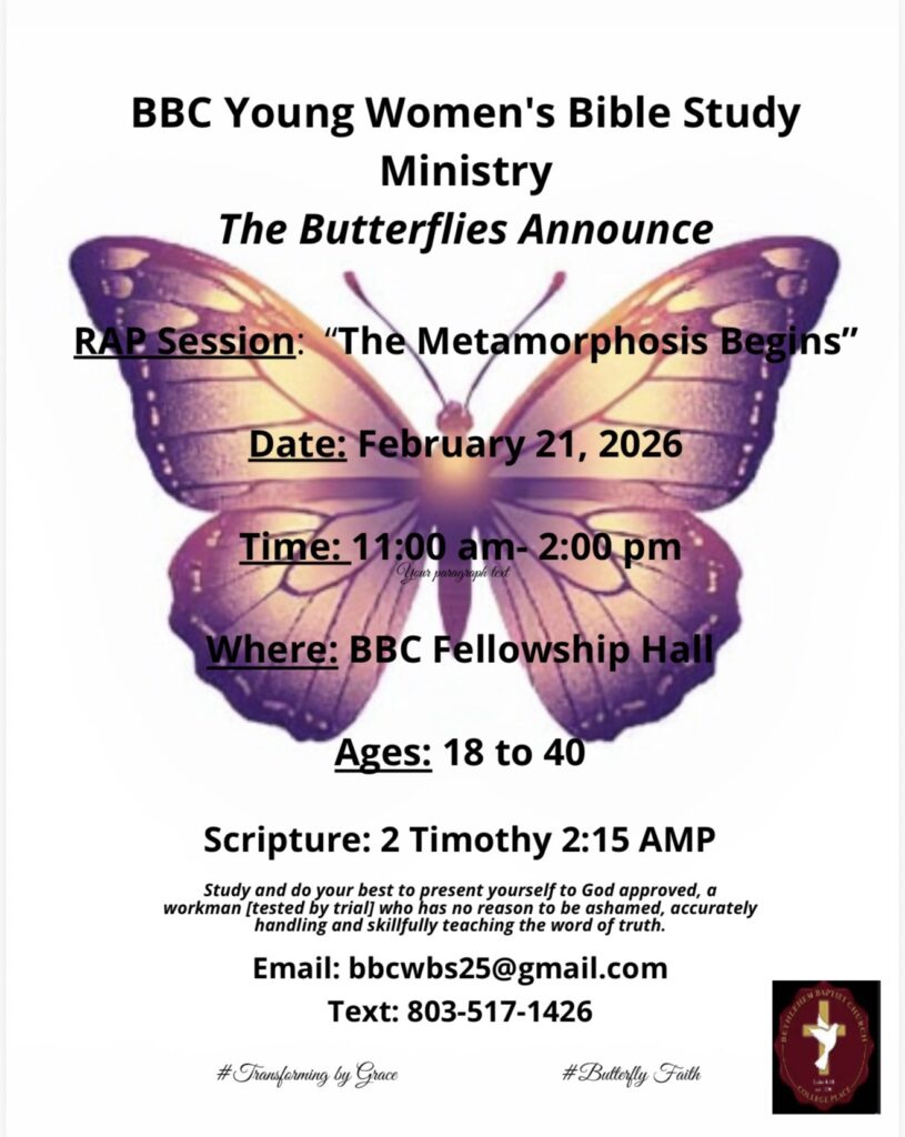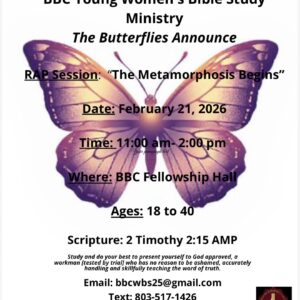 BBC Young Women’s Bible Study Join the BBC Young Women’s Bible Study Ministry for an empowering RAP Session designed to inspire spiritual growth, transformation, and purpose-driven living. 📅 Date: Saturday, February 21, 2026 ⏰ Time:... 21 Feb 11:00 am - 2:00 pm