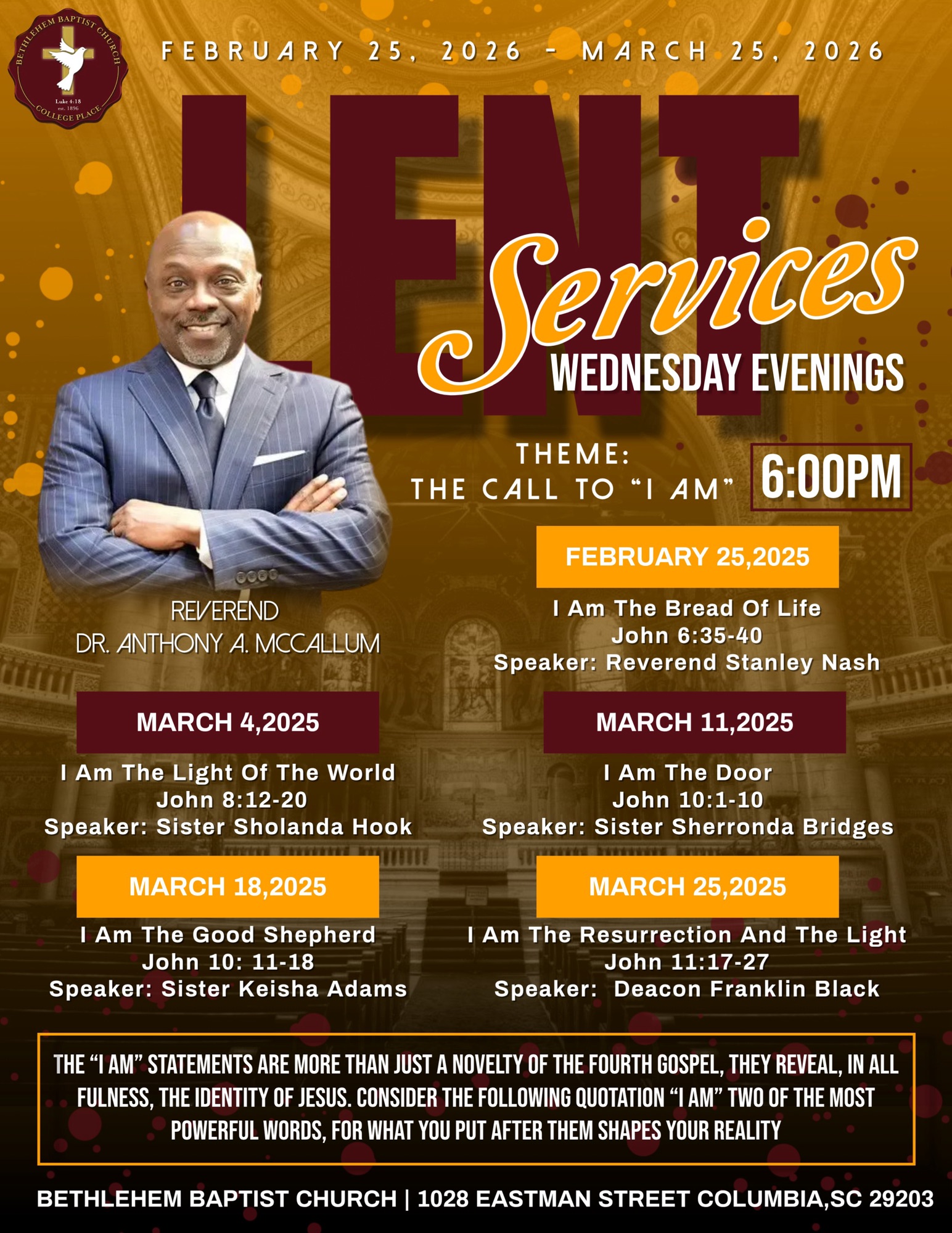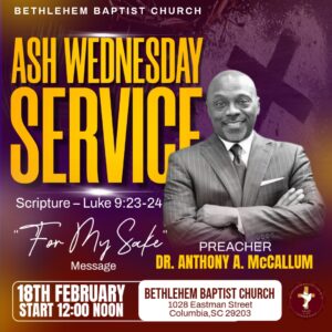 Ash Wednesday Service 18 Feb 12:00 pm - 1:00 pm Bethlehem Baptist Church1028 Eastman St, Columbia, SC 29203